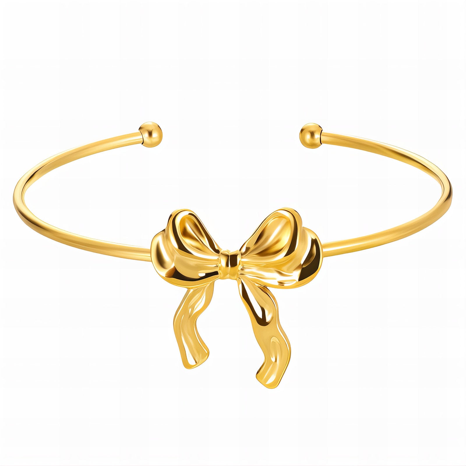 The Belle Bow Cuff features a polished golden bow that embodies femininity, joy, and classic charm. Its sleek open-cuff design adds a touch of playful sophistication. Lightweight and comfortable for effortless everyday wear. Perfect for stacking or wearing solo as a graceful statement piece. Ideal for anyone who loves jewelry that feels both sweet and stylish.