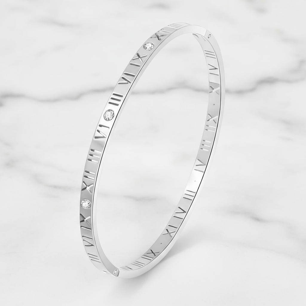 The Claudia Bangle blends timeless Roman elegance with a sleek stainless-steel finish. Engraved with classic Roman numerals, it captures a sense of history and refined sophistication. Subtle crystal accents add just the right touch of sparkle for a polished, modern look. Versatile and minimalist, it pairs effortlessly with both everyday outfits and formal styles. A perfect accessory for those who appreciate clean lines and enduring charm.