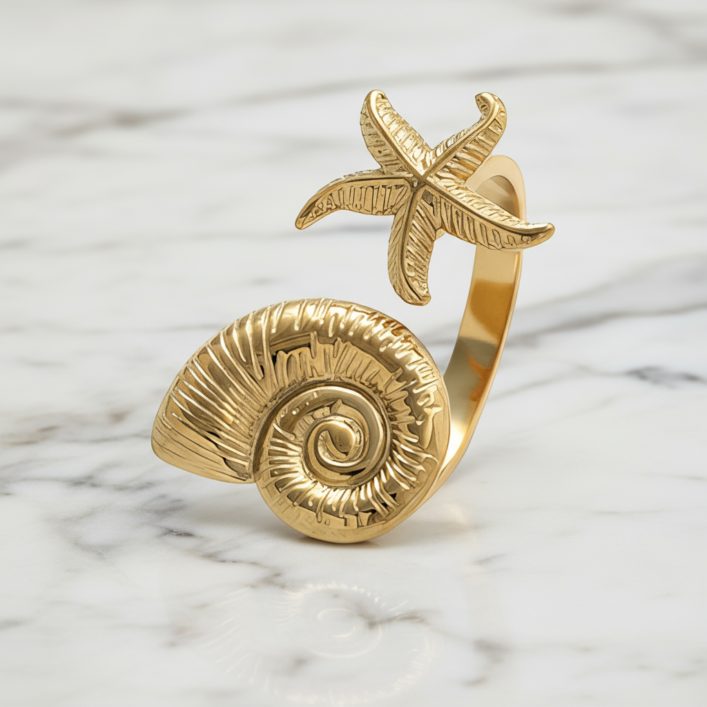 The Marina Ring blends a beautifully detailed seashell swirl with a graceful starfish accent for a true ocean-inspired look. Crafted in polished gold-toned stainless steel, it offers shine, durability, and elegant texture. The open-ring design gives it a light, airy feel that stands out effortlessly. Perfect for beach lovers and anyone drawn to coastal beauty. A radiant statement piece inspired by the sea.